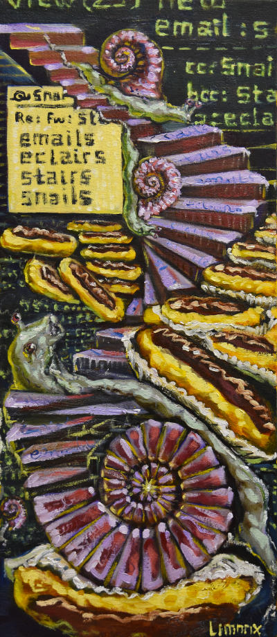 "Muscle Castle" AI 3, 2024, oil on hemp, 12x18in. Prompt by Anton | "snails, emails, stairs, eclairs" AI 6, 2024, oil on canvas, 10x23in. Prompt by Anthony Bamonte |