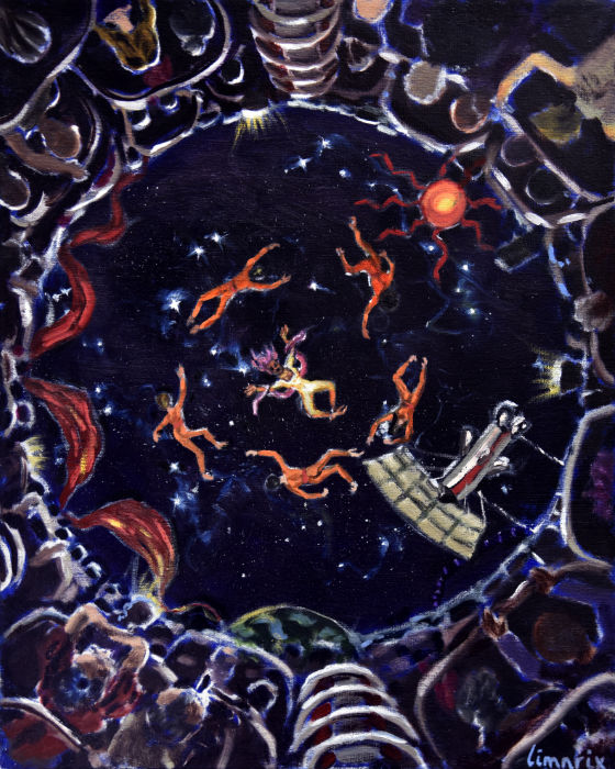 "I was pacified by corporate security and all I got was this lousy t-shirt." AI 8, 2024, oil on canvas, 10x15in. Prompt by John M. | "A Space Opera" AI 9, 2025, oil on canvas, 16x20in. Prompt by Kira. |