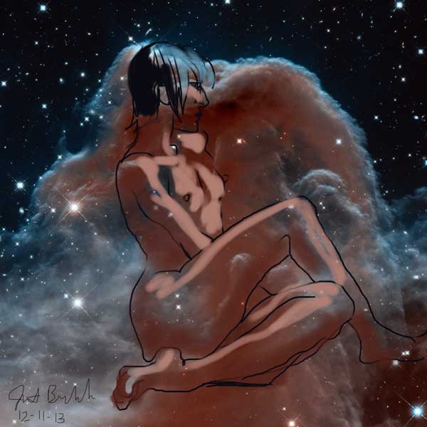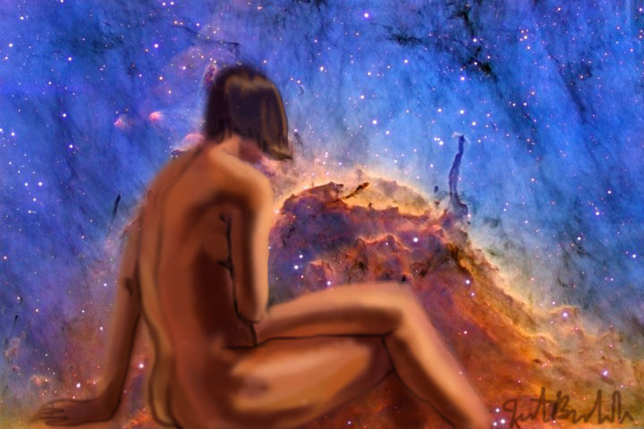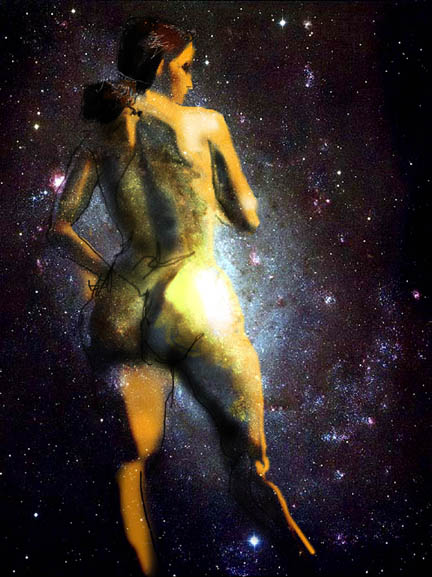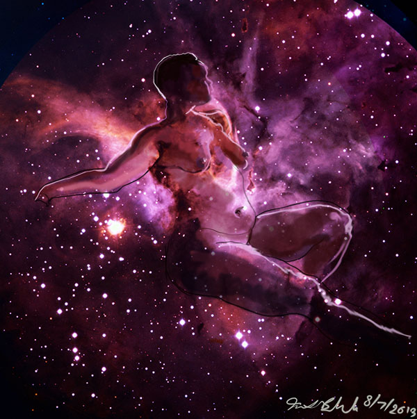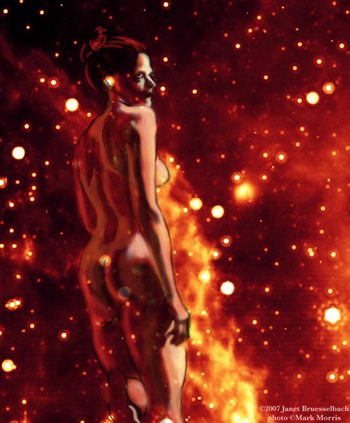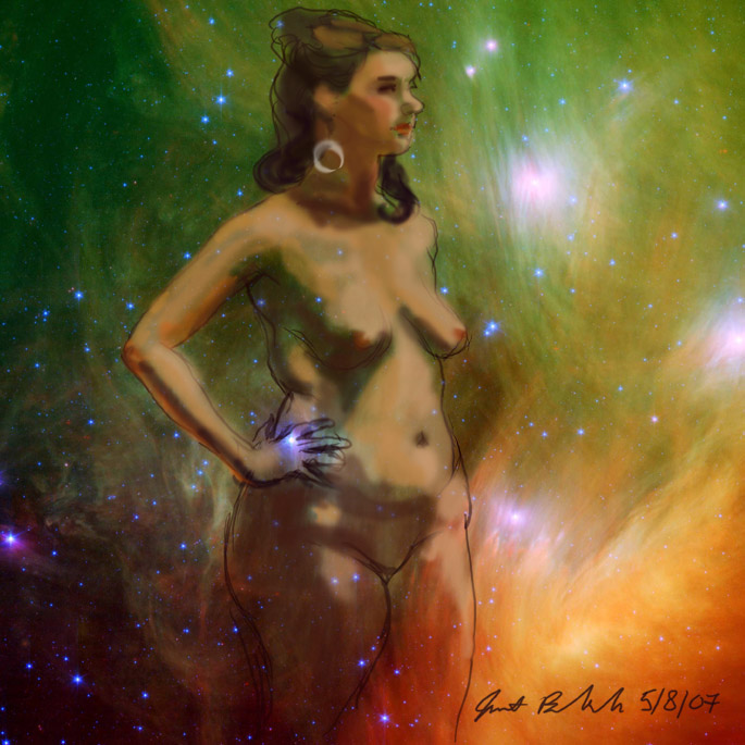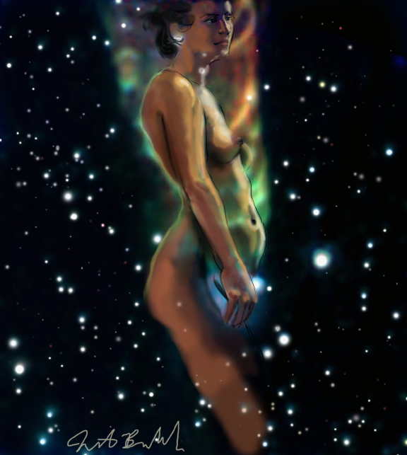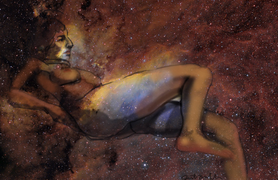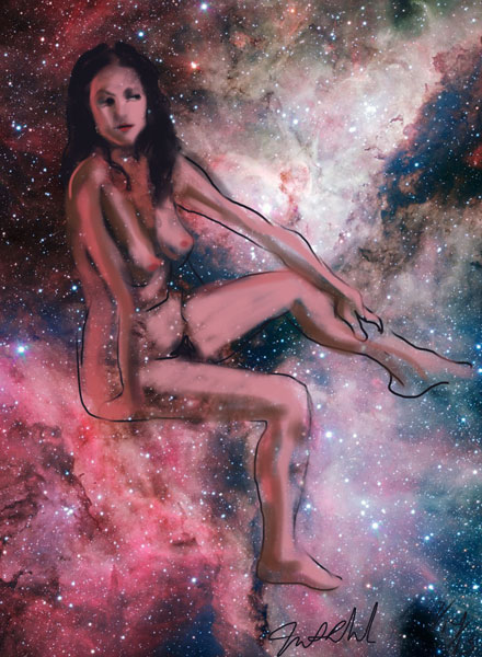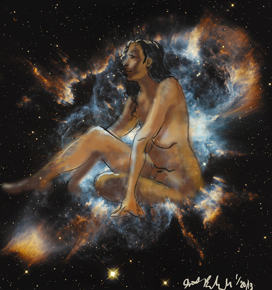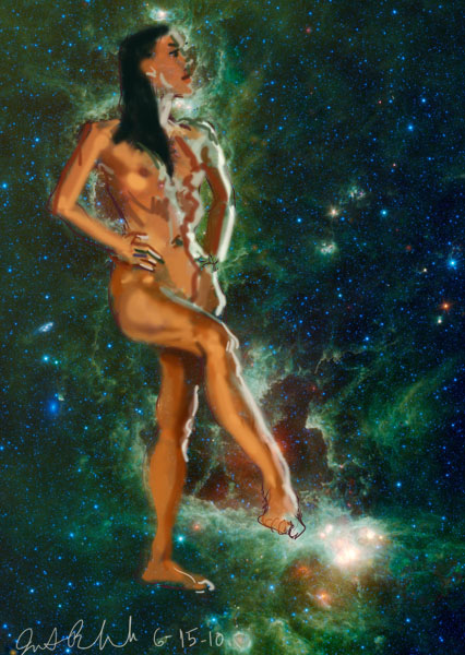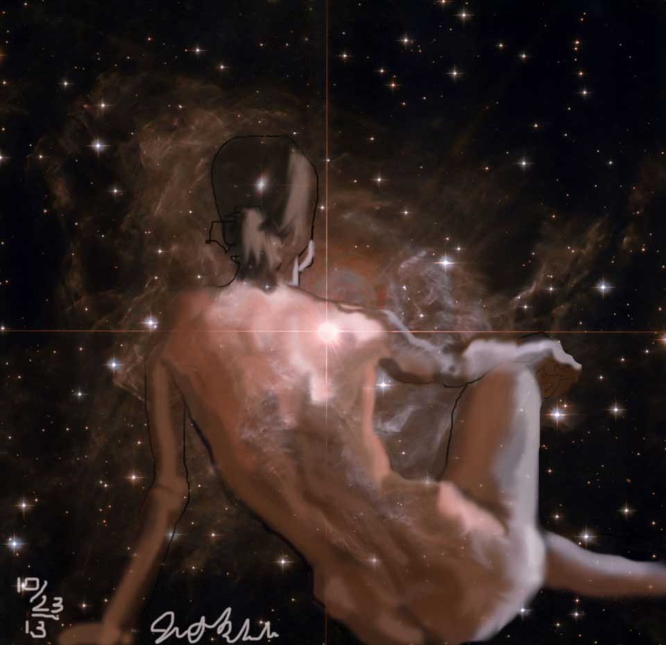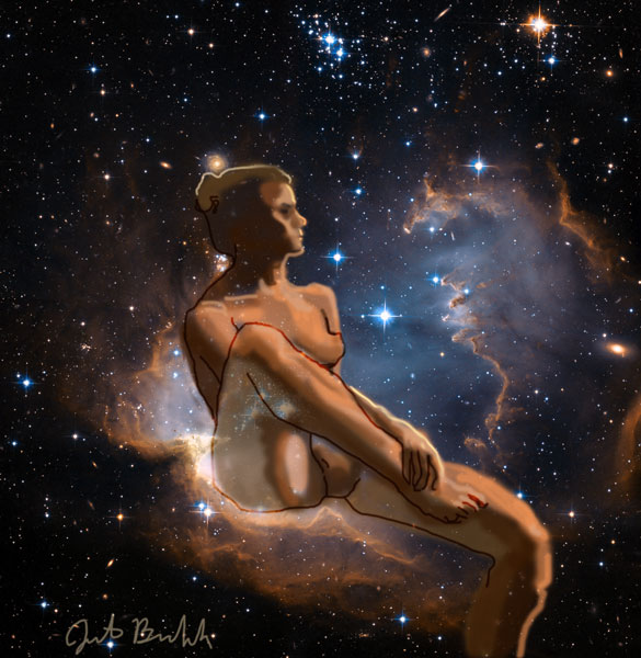Janet Bruesselbach has been making Astrae drawings since 2002. These are sketches all done with a laptop from live models in less than 40 minutes, using backgrounds from satellite space photography available online. All colors are sampled from the background (or allowed to show through from it). She uses only the generic image editing program brushes with the paint, eraser, and smudge tools. Every pose is from a live model, for as long as the model is posing, no longer. Many, especially earlier, sketches were done with her finger on a laptop touchpad, but she also uses a USB drawing tablet and pen. The method means embracing the idiosyncrasies of digital media more often valued for its invisibility. The Astrae reinvent the tactile intimacy of the traditional nude figure study, and imply human scale within naturally abstract technological wonders.