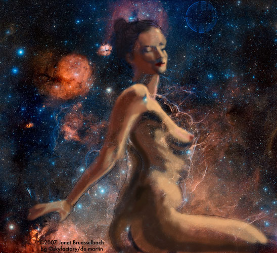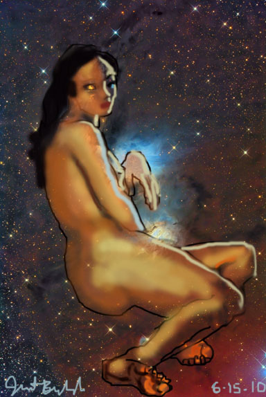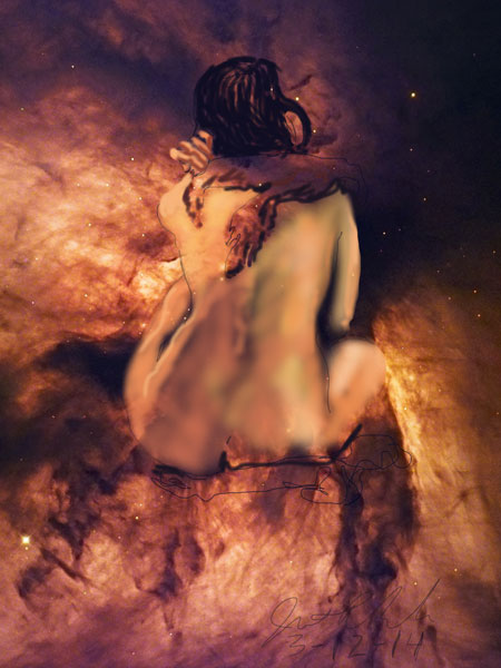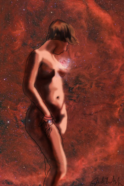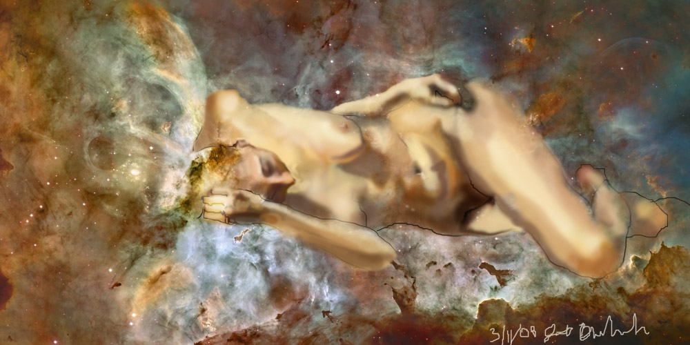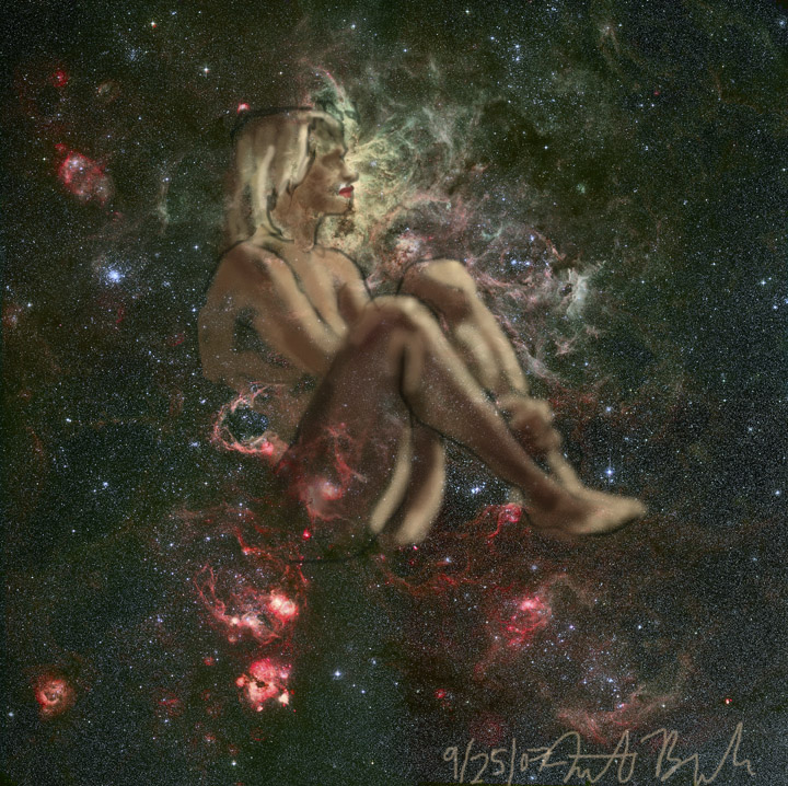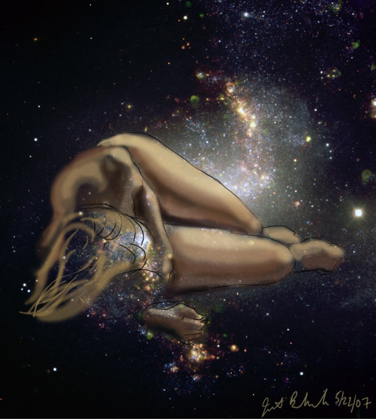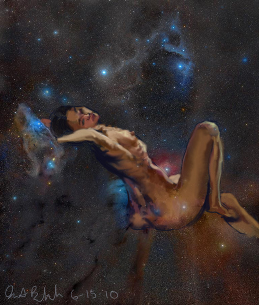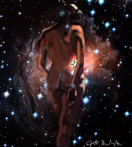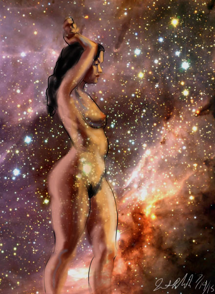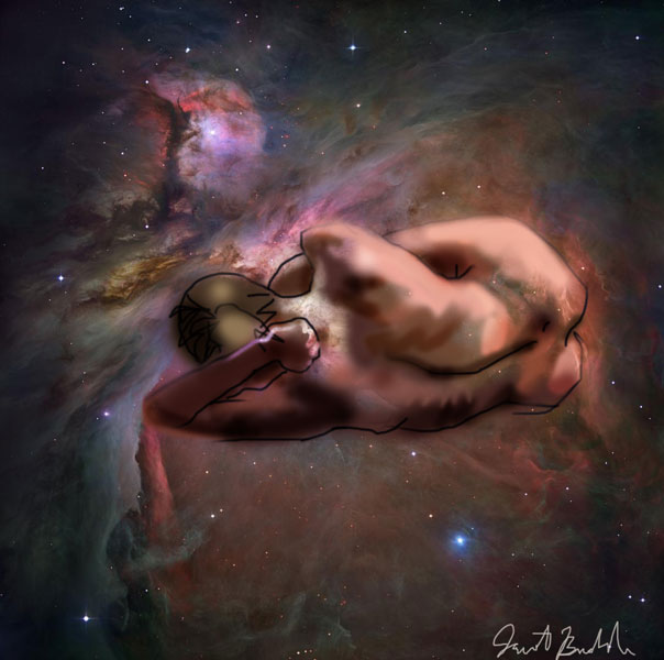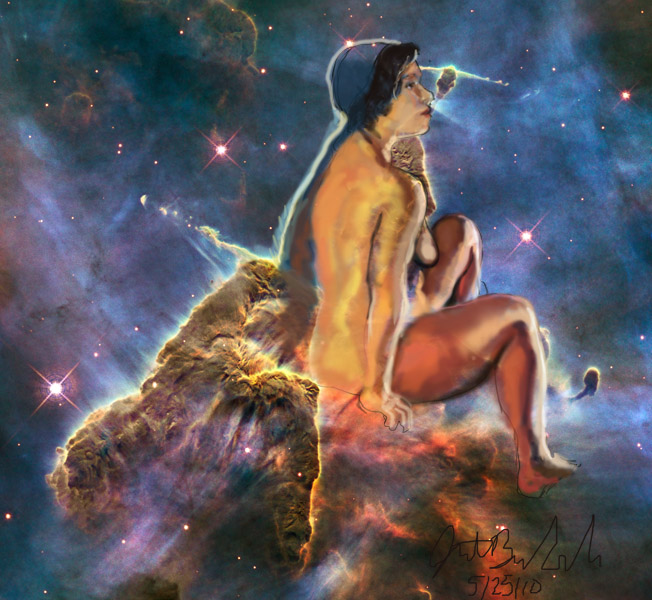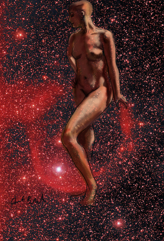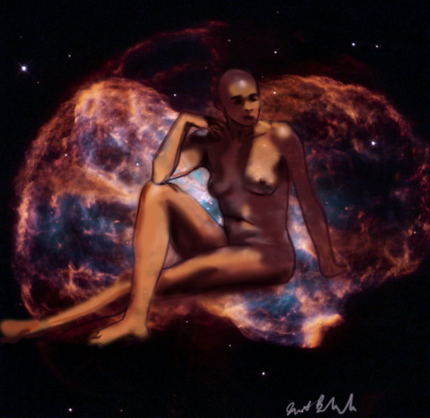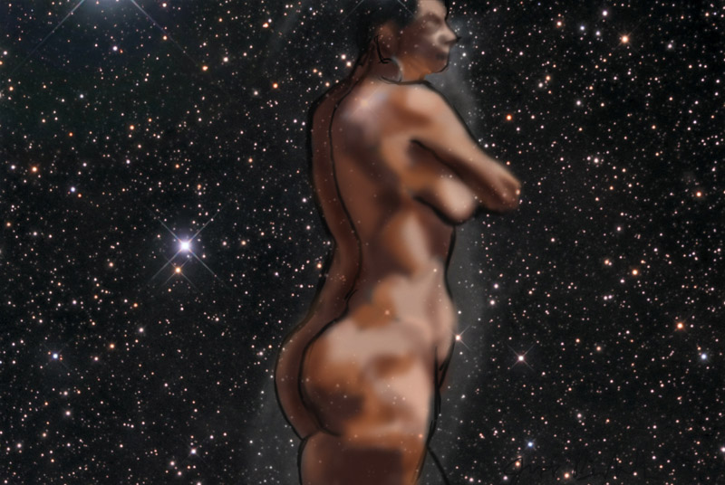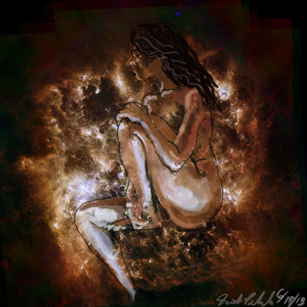 Janet Bruesselbach has been making Astrae drawings since 2002. These are sketches all done with a laptop from live models in less than 40 minutes, using backgrounds from satellite space photography available online. All colors are sampled from the background (or allowed to show through from it). She uses only the generic image editing program brushes with the paint, eraser, and smudge tools. Every pose is from a live model, for as long as the model is posing, no longer. Many, especially earlier, sketches were done with her finger on a laptop touchpad, but she also uses a USB drawing tablet and pen. The method means embracing the idiosyncrasies of digital media more often valued for its invisibility. The Astrae reinvent the tactile intimacy of the traditional nude figure study, and imply human scale within naturally abstract technological wonders.