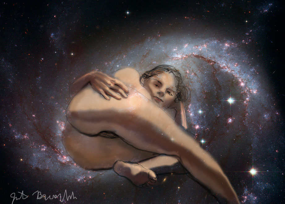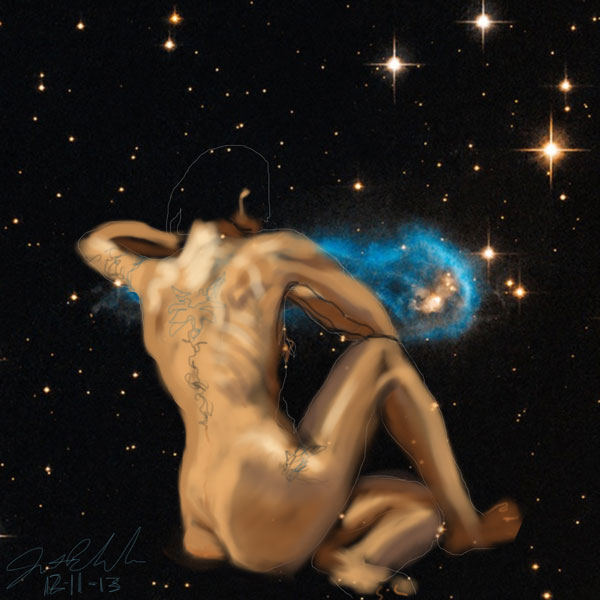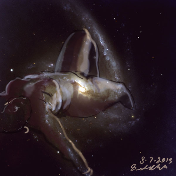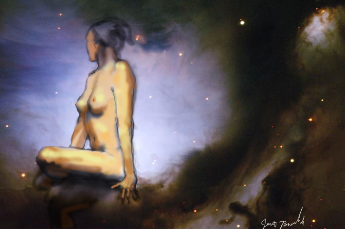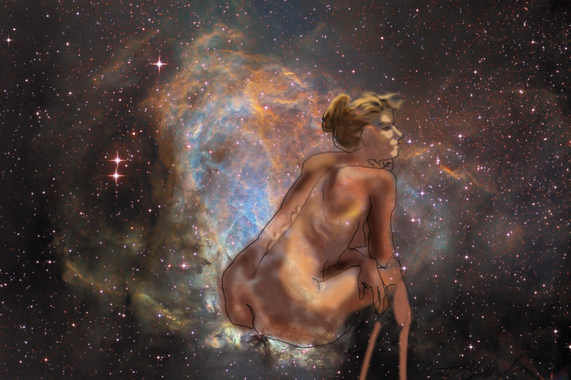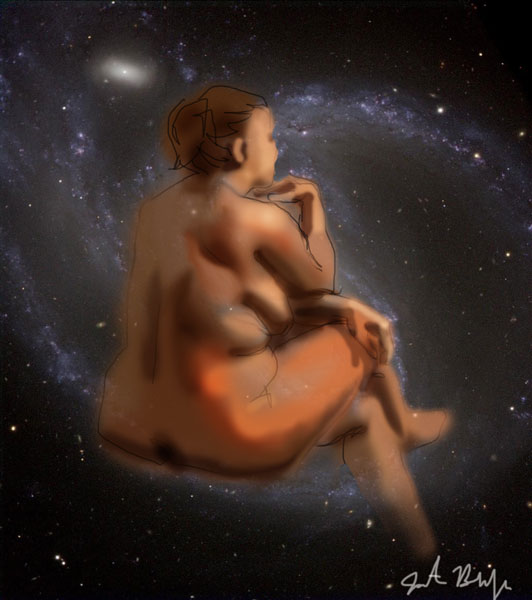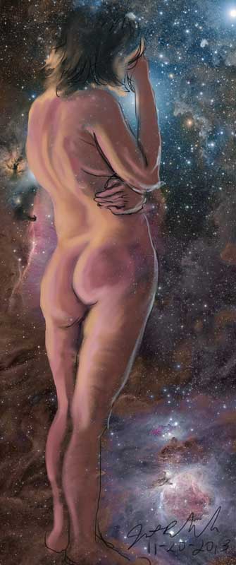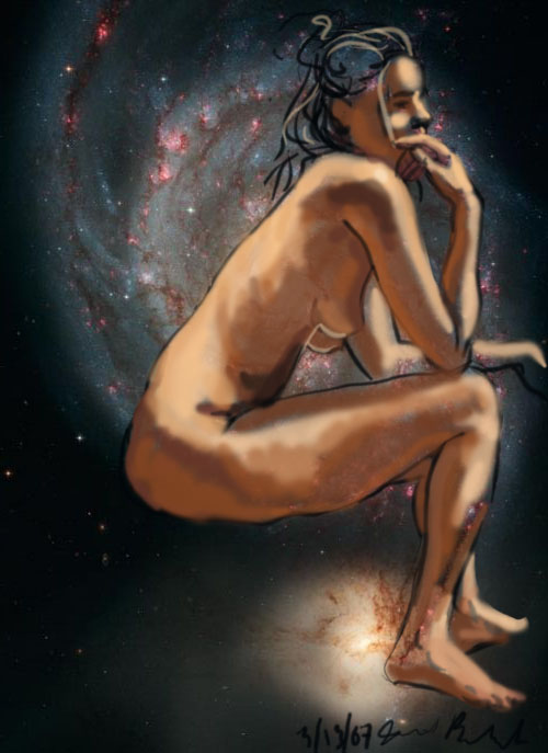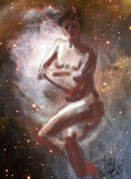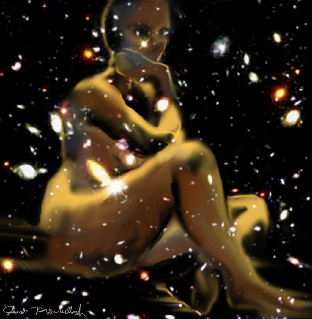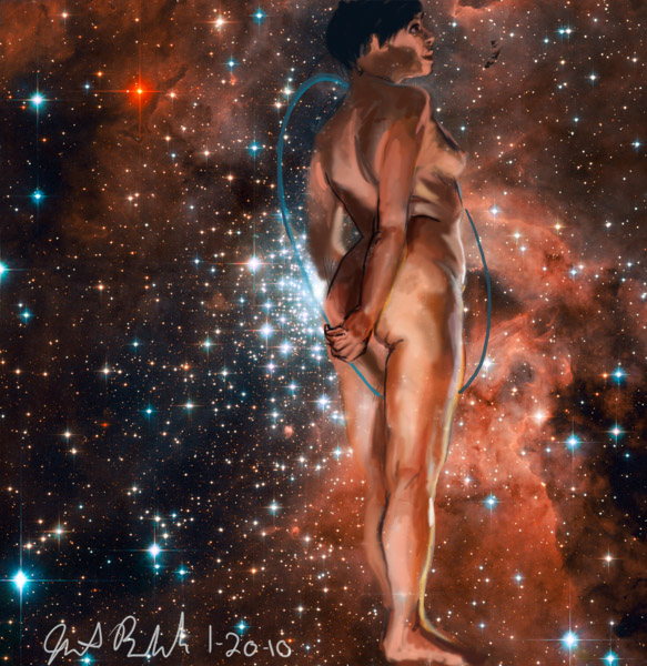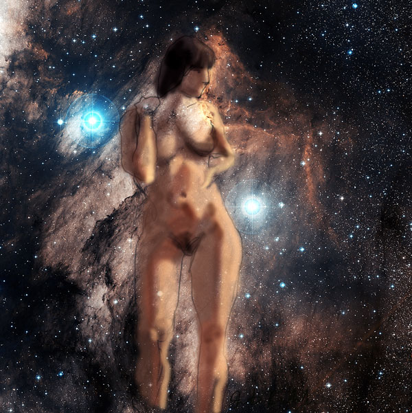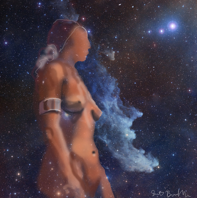 Janet Bruesselbach has been making Astrae drawings since 2002. These are sketches all done with a laptop from live models in less than 40 minutes, using backgrounds from satellite space photography available online. All colors are sampled from the background (or allowed to show through from it). She uses only the generic image editing program brushes with the paint, eraser, and smudge tools. Every pose is from a live model, for as long as the model is posing, no longer. Many, especially earlier, sketches were done with her finger on a laptop touchpad, but she also uses a USB drawing tablet and pen. The method means embracing the idiosyncrasies of digital media more often valued for its invisibility. The Astrae reinvent the tactile intimacy of the traditional nude figure study, and imply human scale within naturally abstract technological wonders.