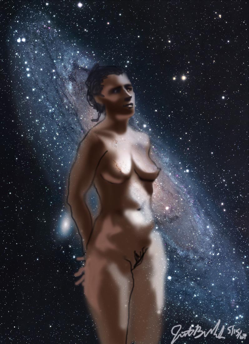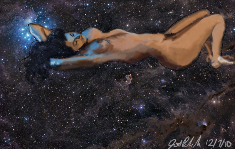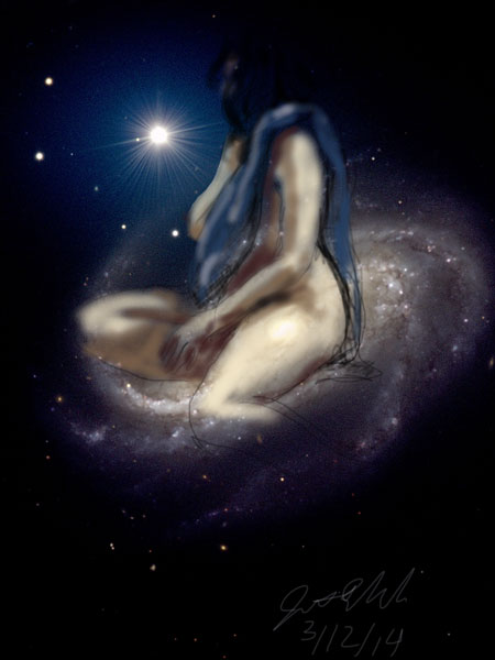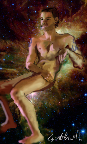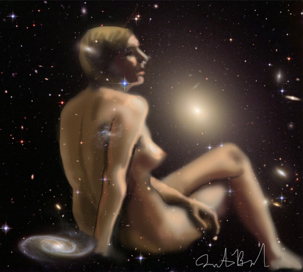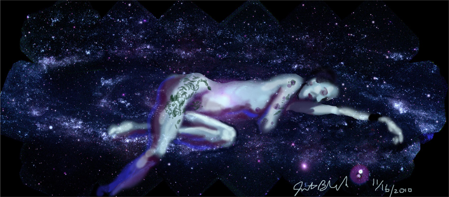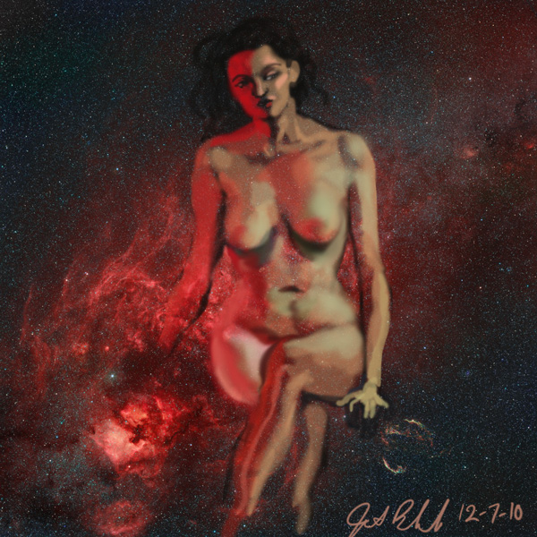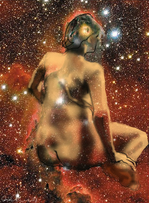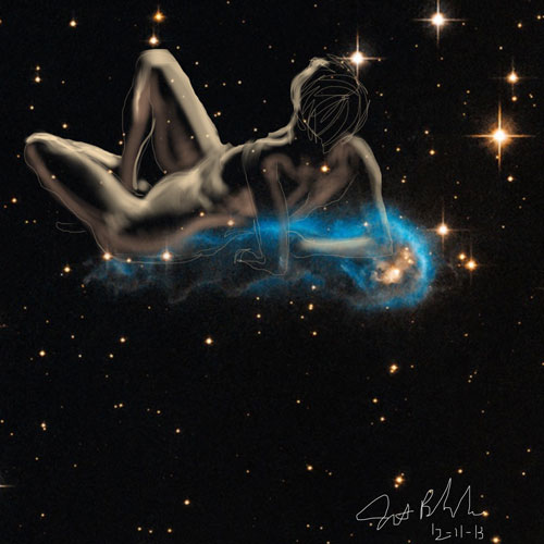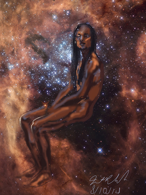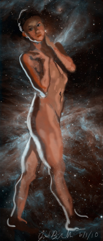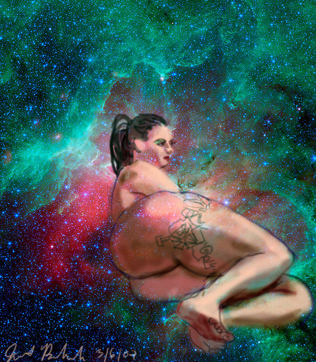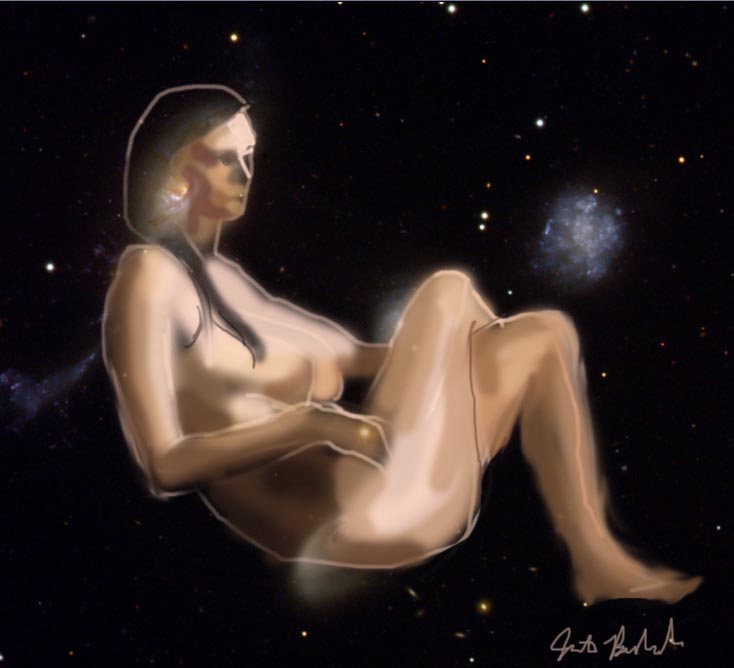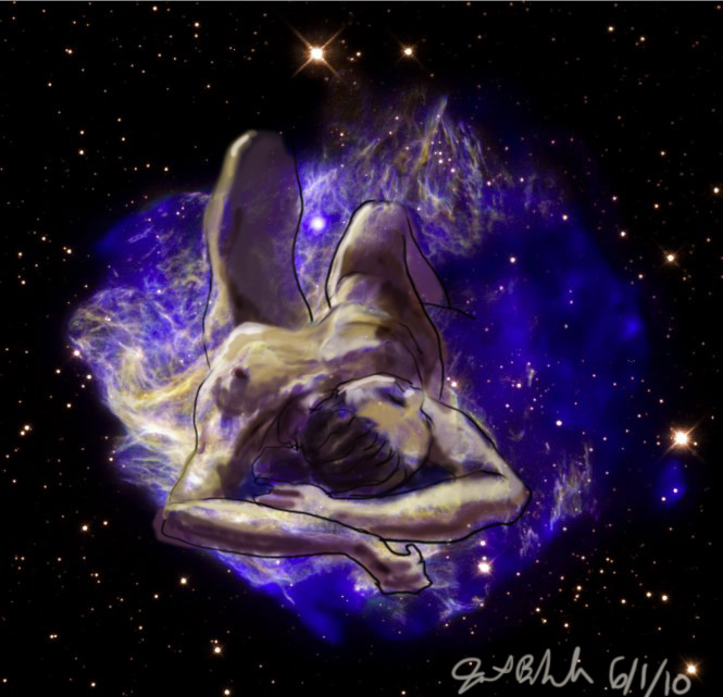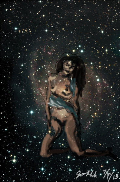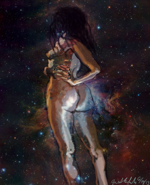 Janet Bruesselbach has been making Astrae drawings since 2002. These are sketches all done with a laptop from live models in less than 40 minutes, using backgrounds from satellite space photography available online. All colors are sampled from the background (or allowed to show through from it). She uses only the generic image editing program brushes with the paint, eraser, and smudge tools. Every pose is from a live model, for as long as the model is posing, no longer. Many, especially earlier, sketches were done with her finger on a laptop touchpad, but she also uses a USB drawing tablet and pen. The method means embracing the idiosyncrasies of digital media more often valued for its invisibility. The Astrae reinvent the tactile intimacy of the traditional nude figure study, and imply human scale within naturally abstract technological wonders.