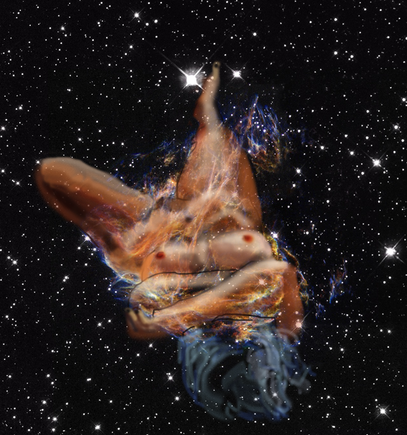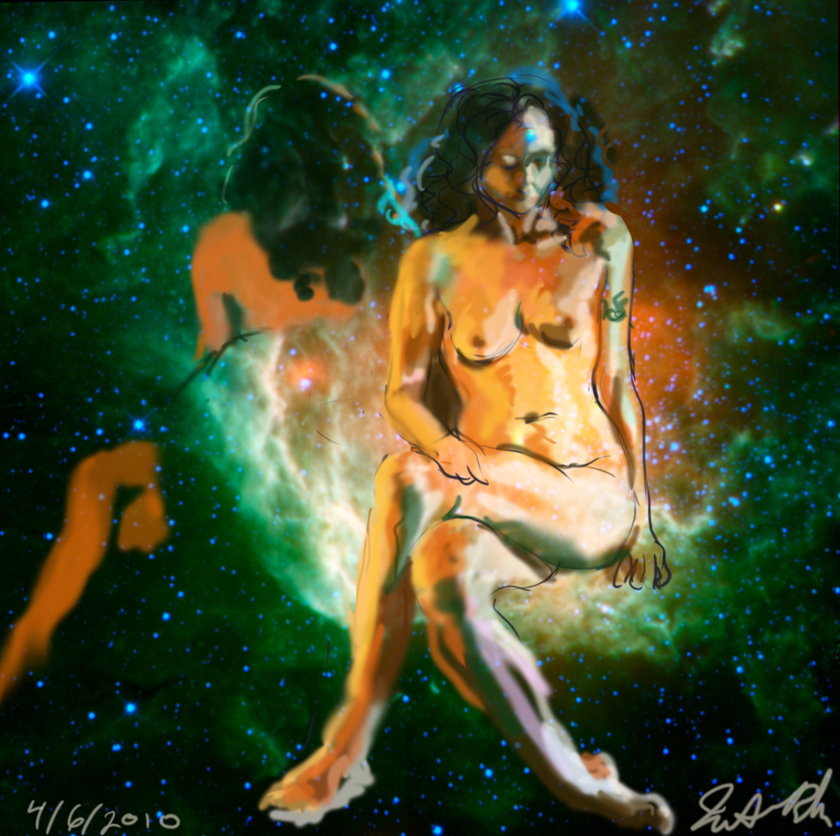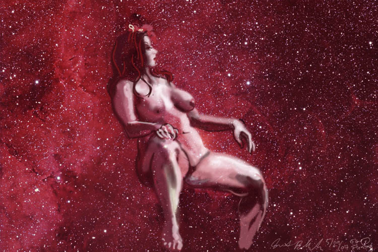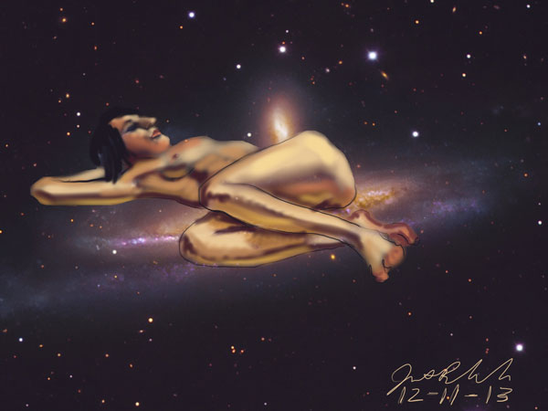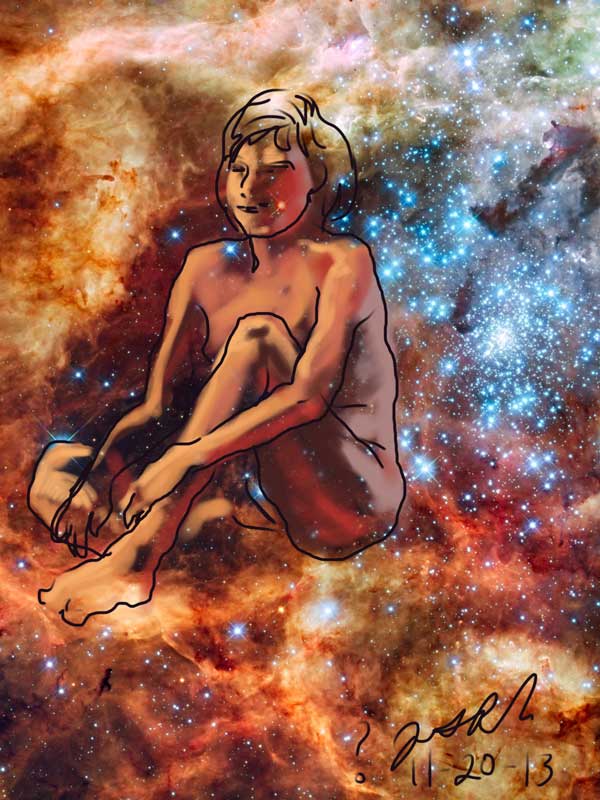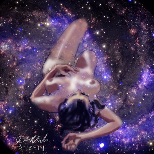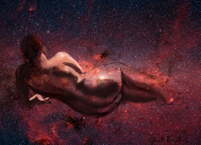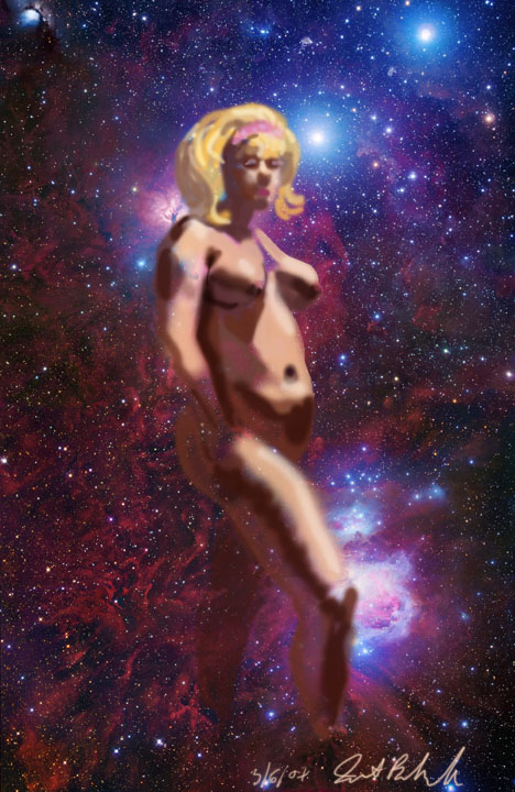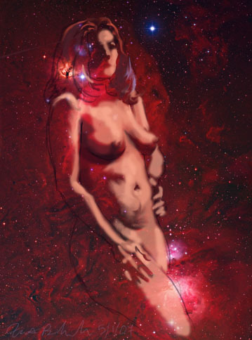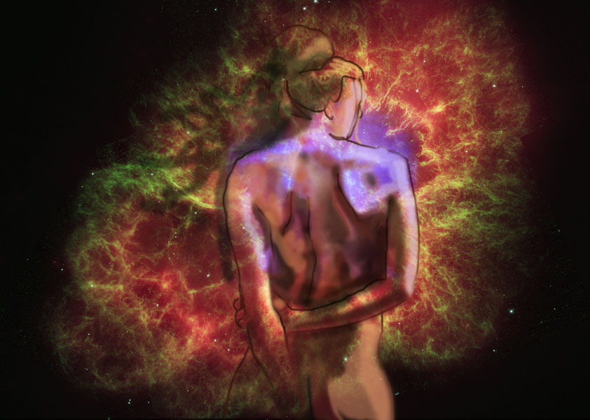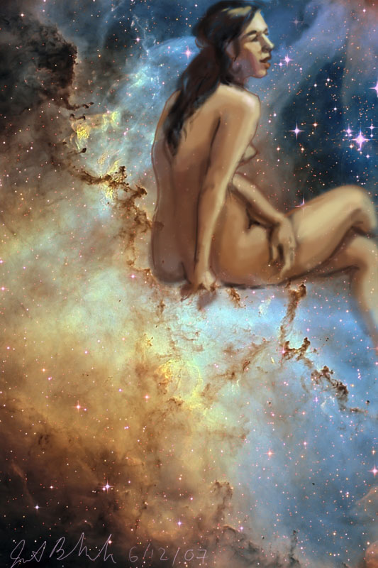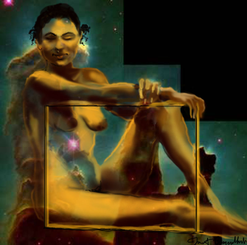 Janet Bruesselbach has been making Astrae drawings since 2002. These are sketches all done with a laptop from live models in less than 40 minutes, using backgrounds from satellite space photography available online. All colors are sampled from the background (or allowed to show through from it). She uses only the generic image editing program brushes with the paint, eraser, and smudge tools. Every pose is from a live model, for as long as the model is posing, no longer. Many, especially earlier, sketches were done with her finger on a laptop touchpad, but she also uses a USB drawing tablet and pen. The method means embracing the idiosyncrasies of digital media more often valued for its invisibility. The Astrae reinvent the tactile intimacy of the traditional nude figure study, and imply human scale within naturally abstract technological wonders.