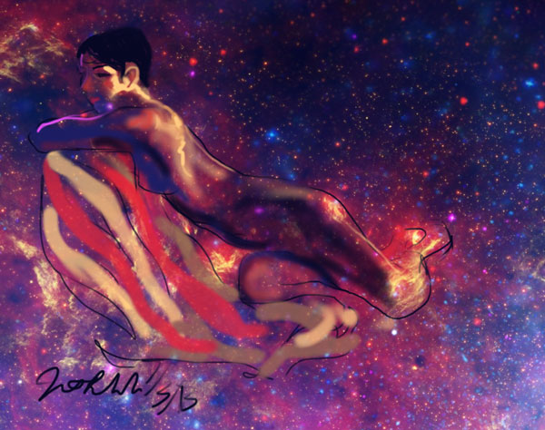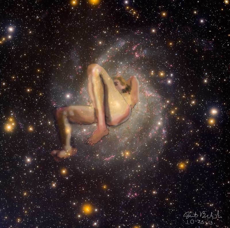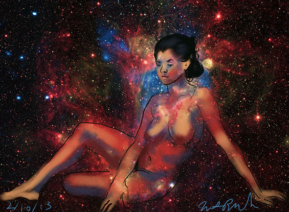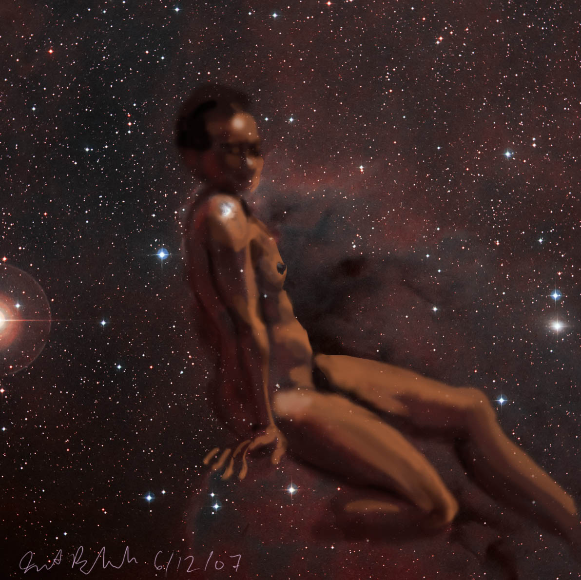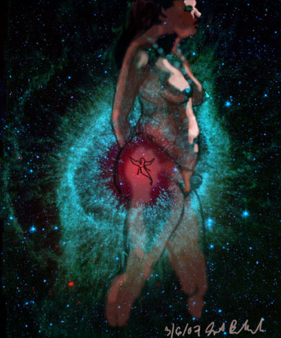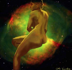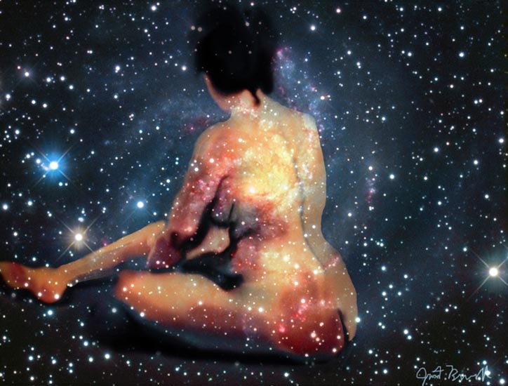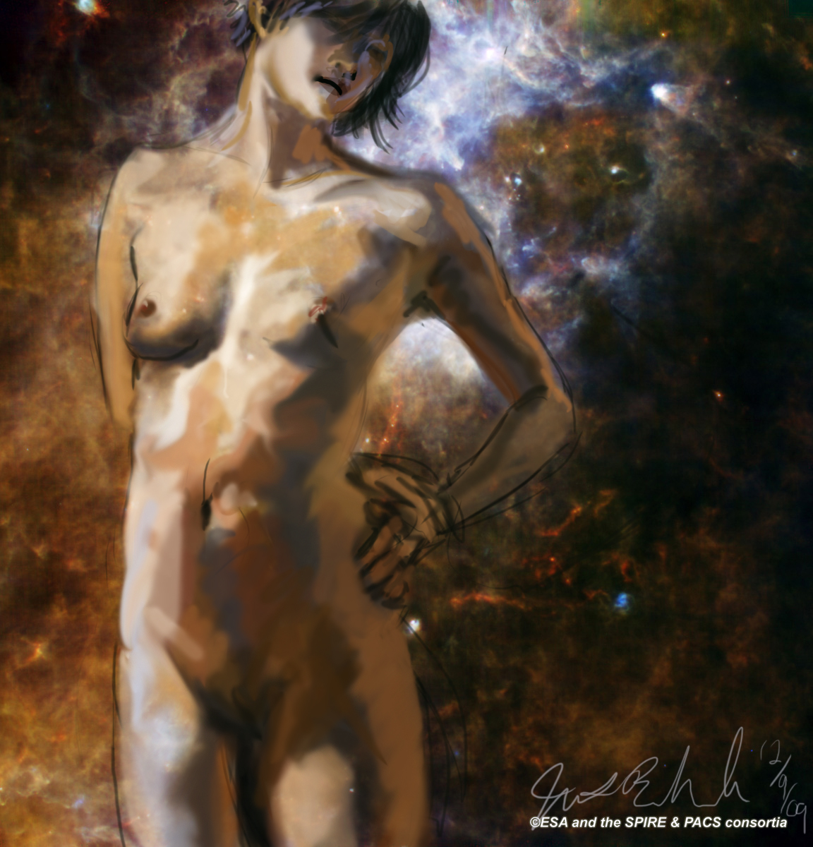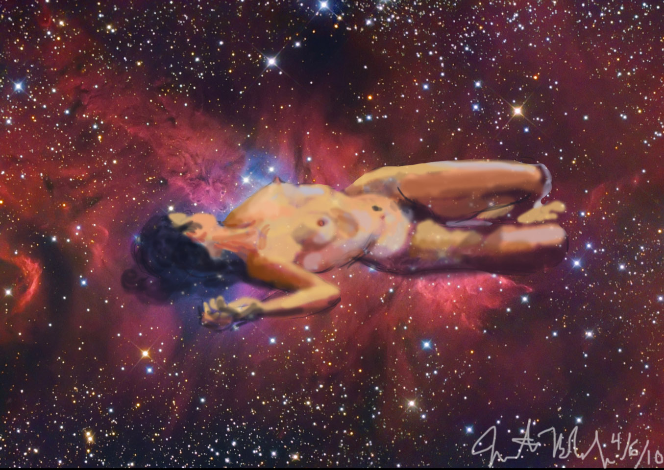 Janet Bruesselbach has been making Astrae drawings since 2002. These are sketches all done with a laptop from live models in less than 40 minutes, using backgrounds from satellite space photography available online. All colors are sampled from the background (or allowed to show through from it). She uses only the generic image editing program brushes with the paint, eraser, and smudge tools. Every pose is from a live model, for as long as the model is posing, no longer. Many, especially earlier, sketches were done with her finger on a laptop touchpad, but she also uses a USB drawing tablet and pen. The method means embracing the idiosyncrasies of digital media more often valued for its invisibility. The Astrae reinvent the tactile intimacy of the traditional nude figure study, and imply human scale within naturally abstract technological wonders.