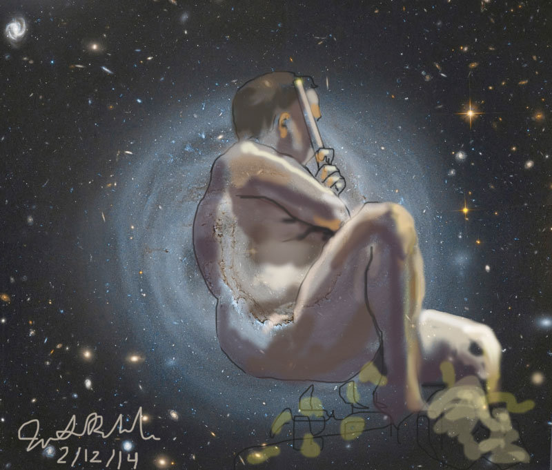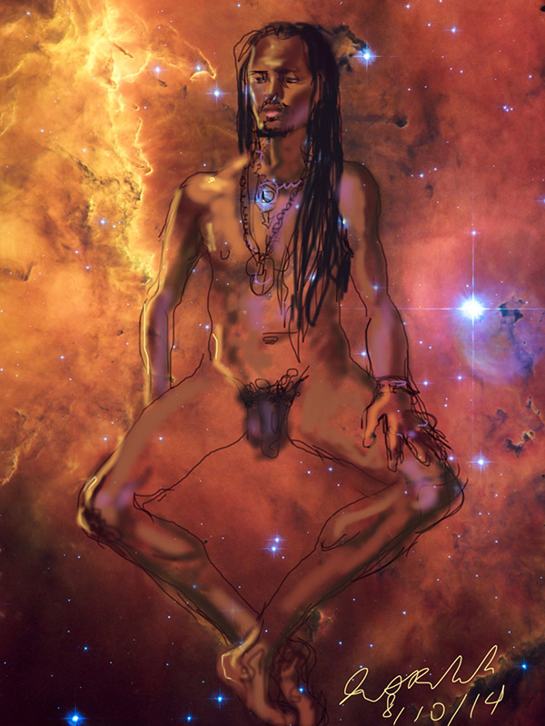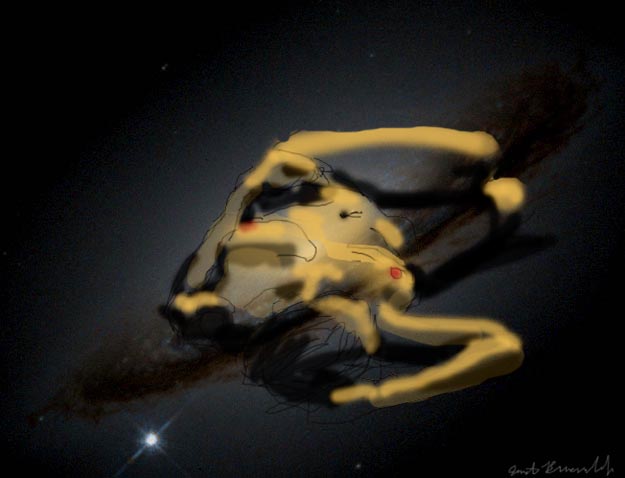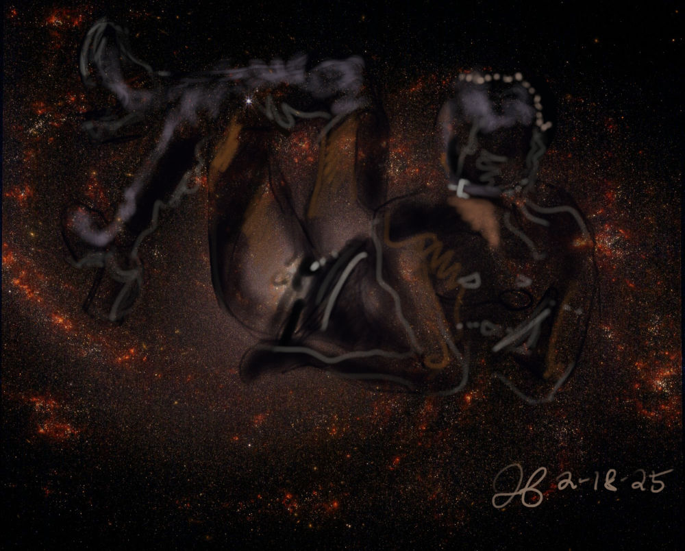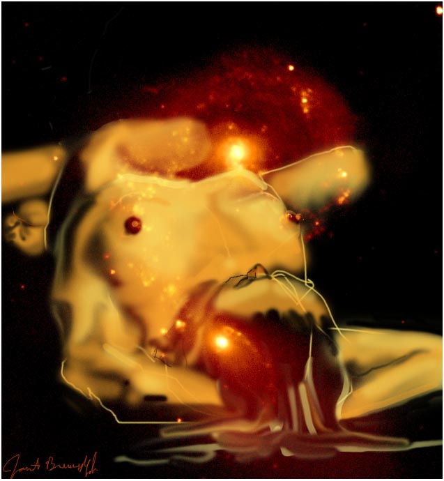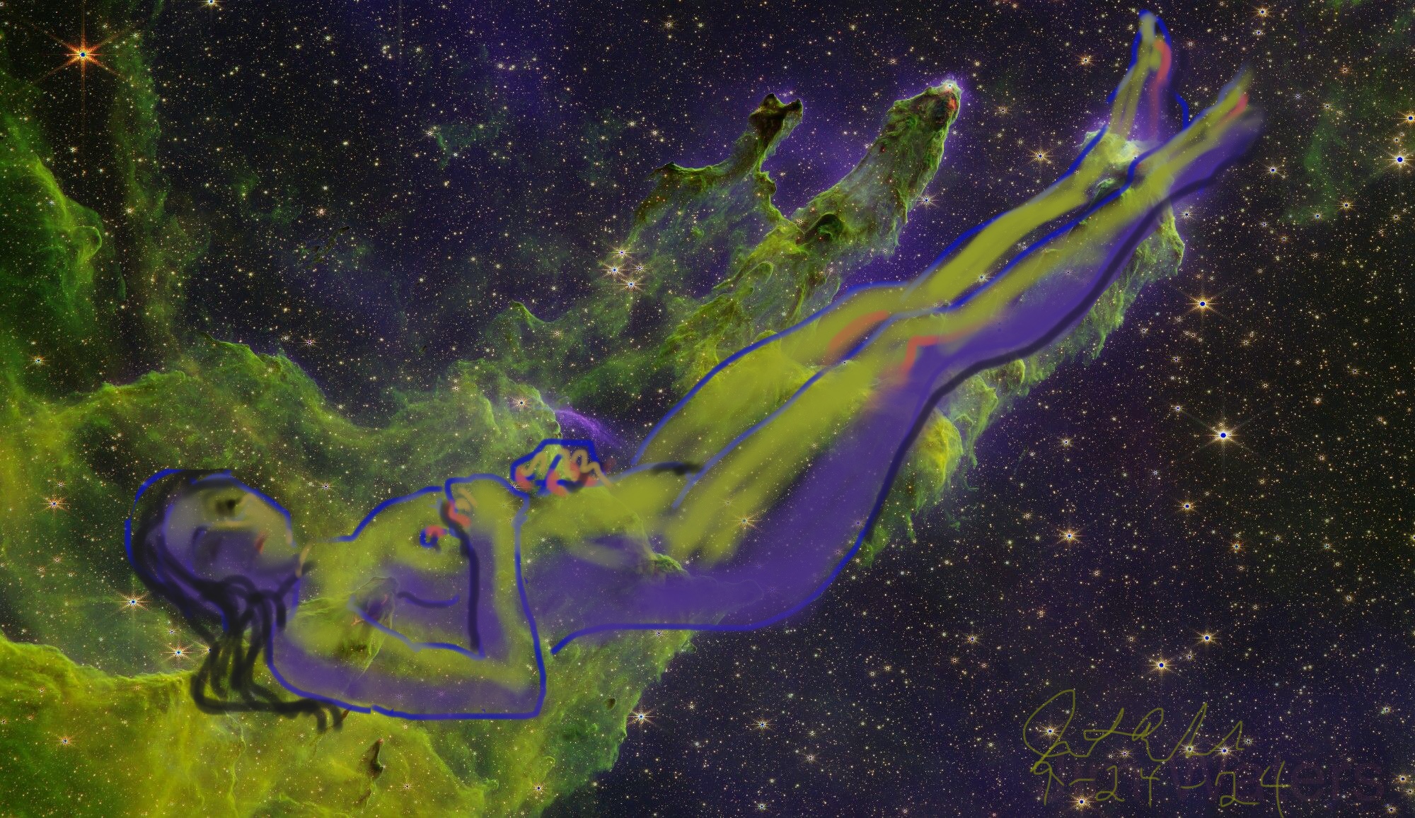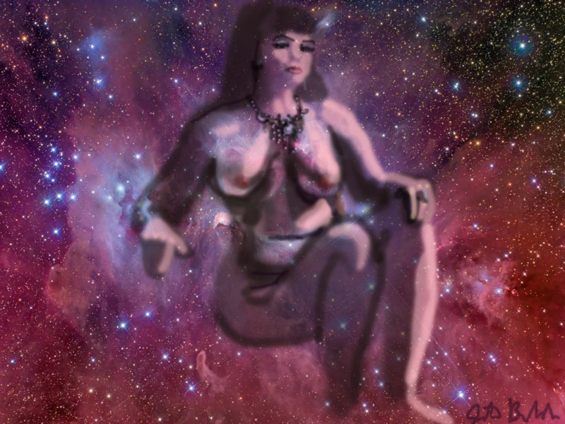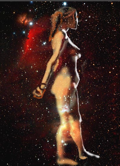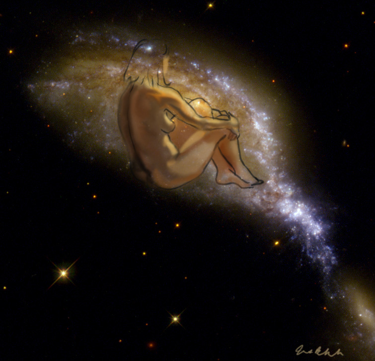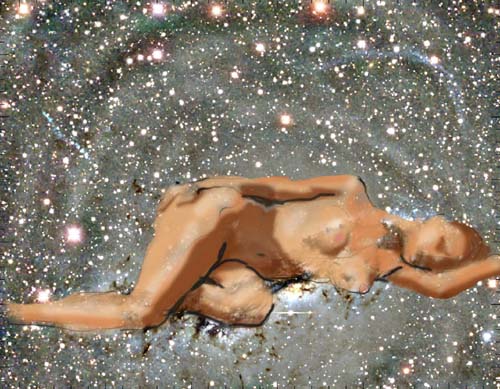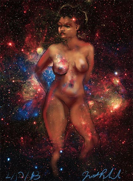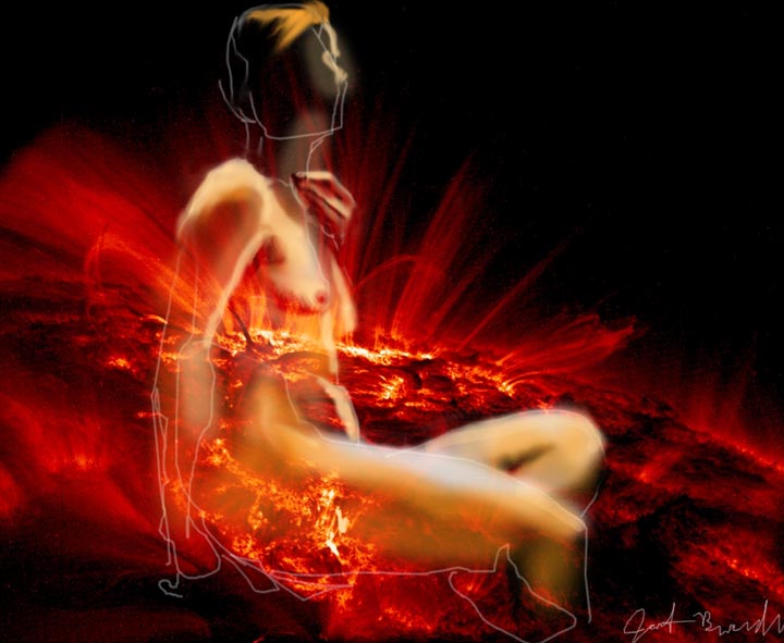 Janet Bruesselbach has been making Astrae drawings since 2002. These are sketches all done with a laptop from live models in less than 40 minutes, using backgrounds from satellite space photography available online. All colors are sampled from the background (or allowed to show through from it). She uses only the generic image editing program brushes with the paint, eraser, and smudge tools. Every pose is from a live model, for as long as the model is posing, no longer. Many, especially earlier, sketches were done with her finger on a laptop touchpad, but she also uses a USB drawing tablet and pen. The method means embracing the idiosyncrasies of digital media more often valued for its invisibility. The Astrae reinvent the tactile intimacy of the traditional nude figure study, and imply human scale within naturally abstract technological wonders.