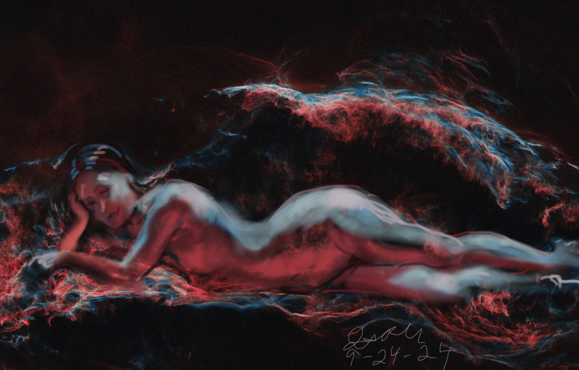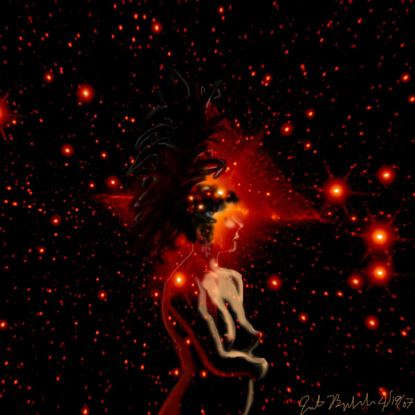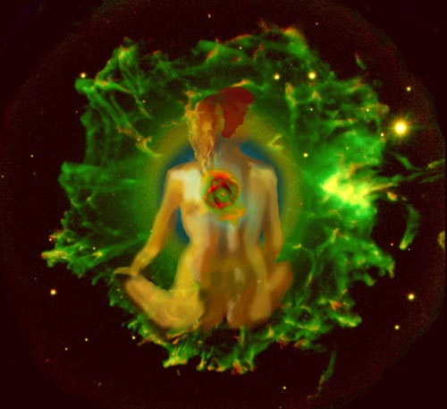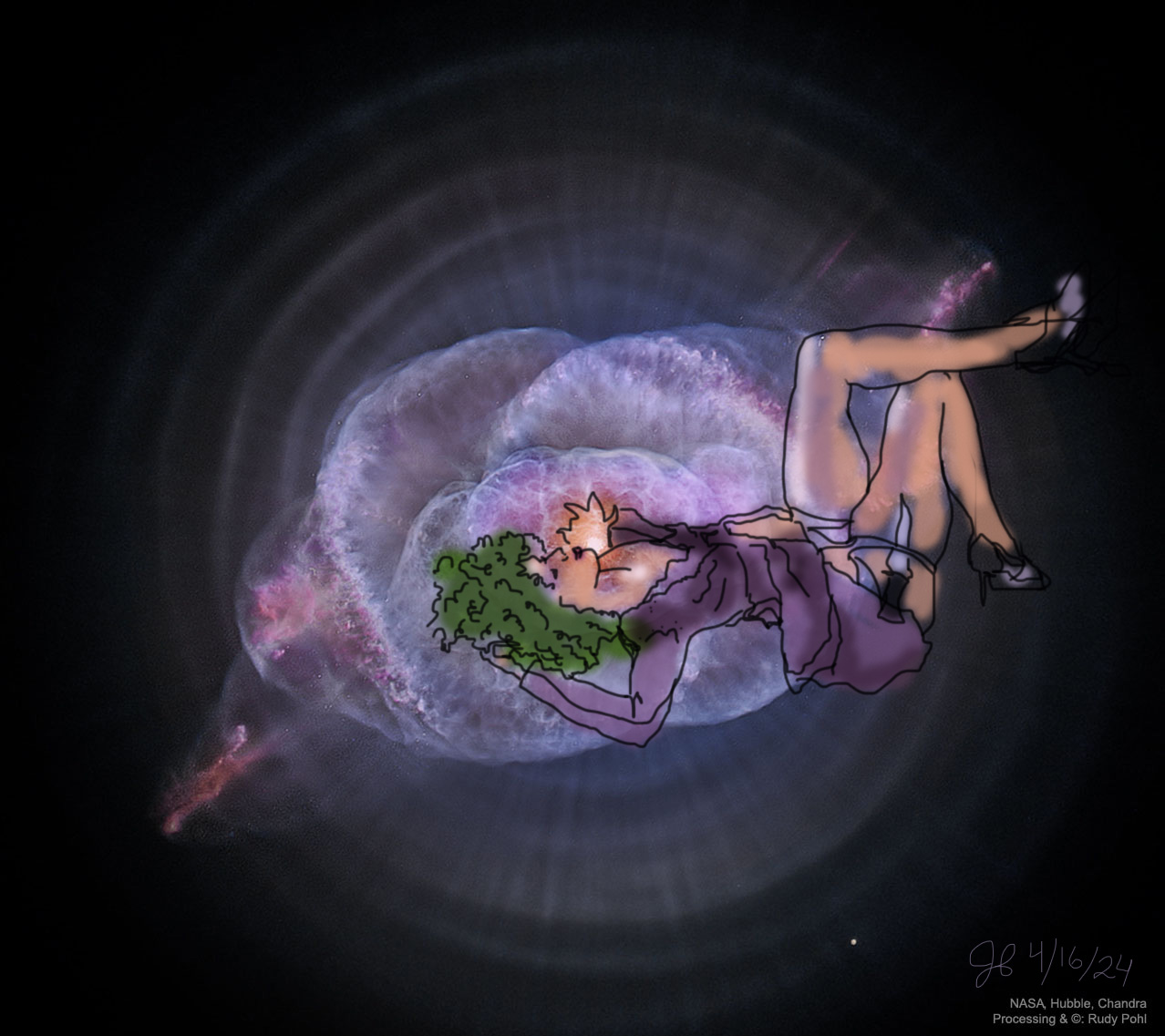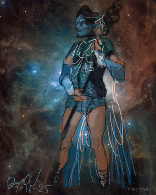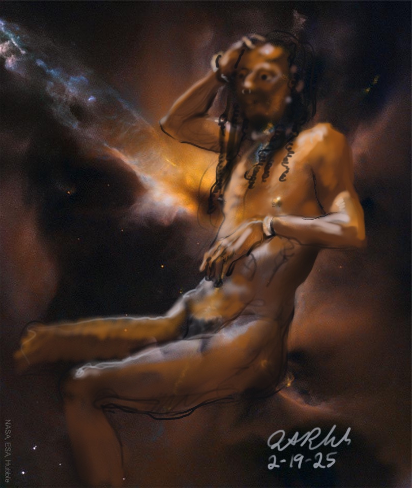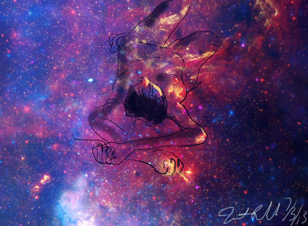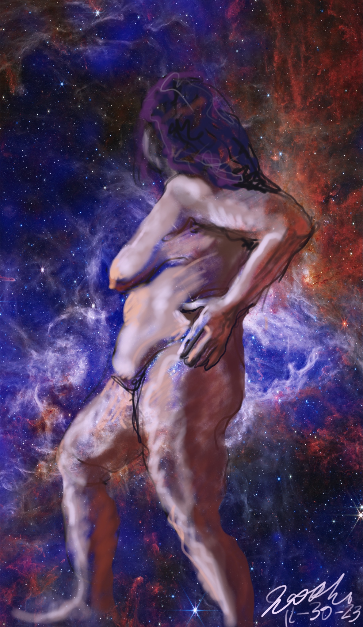 Janet Bruesselbach has been making Astrae drawings since 2002. These are sketches all done with a laptop from live models in less than 40 minutes, using backgrounds from satellite space photography available online. All colors are sampled from the background (or allowed to show through from it). She uses only the generic image editing program brushes with the paint, eraser, and smudge tools. Every pose is from a live model, for as long as the model is posing, no longer. Many, especially earlier, sketches were done with her finger on a laptop touchpad, but she also uses a USB drawing tablet and pen. The method means embracing the idiosyncrasies of digital media more often valued for its invisibility. The Astrae reinvent the tactile intimacy of the traditional nude figure study, and imply human scale within naturally abstract technological wonders.