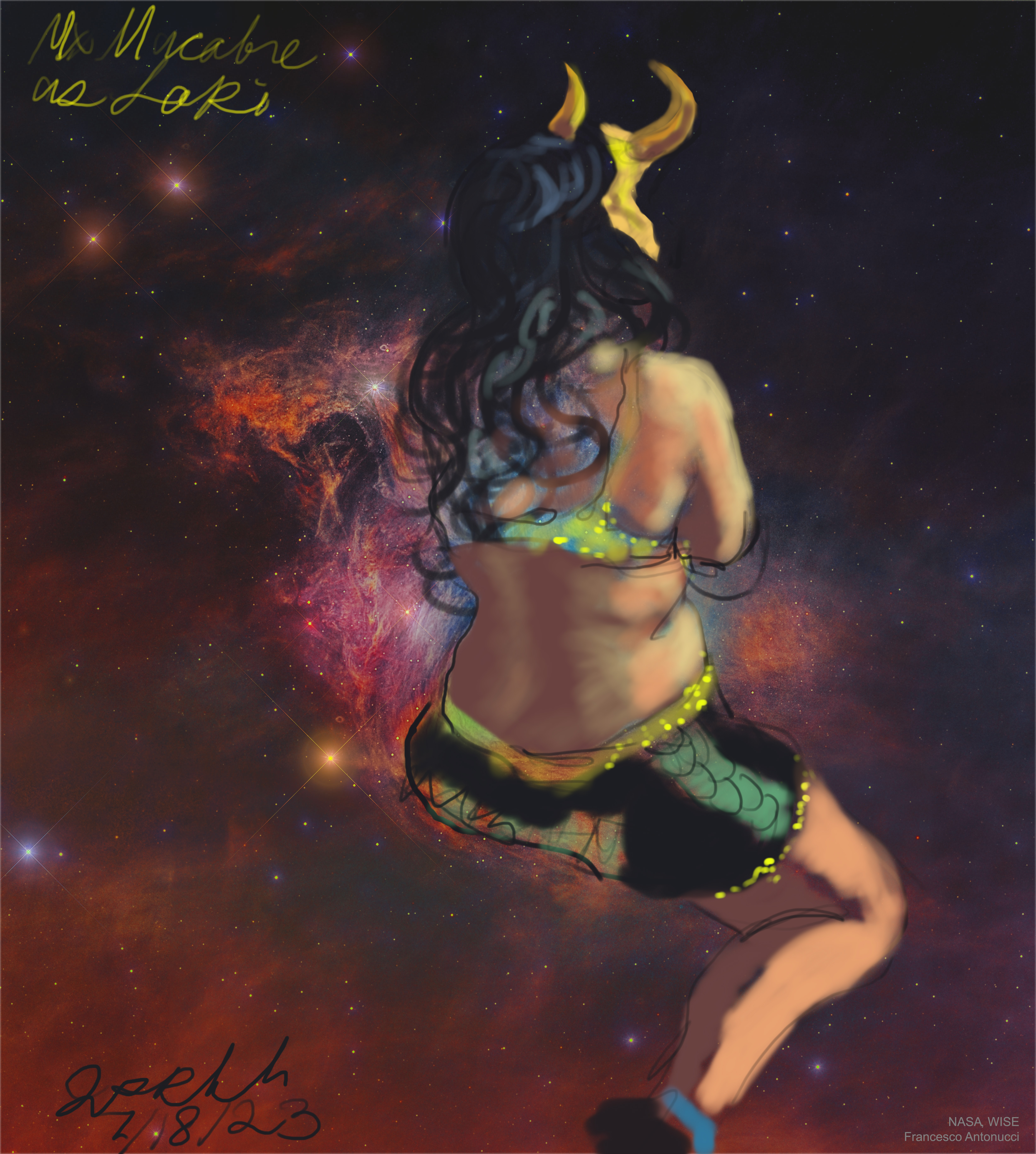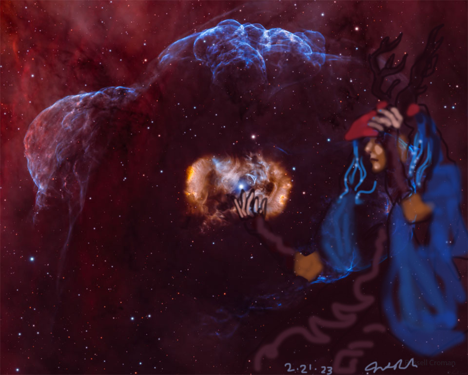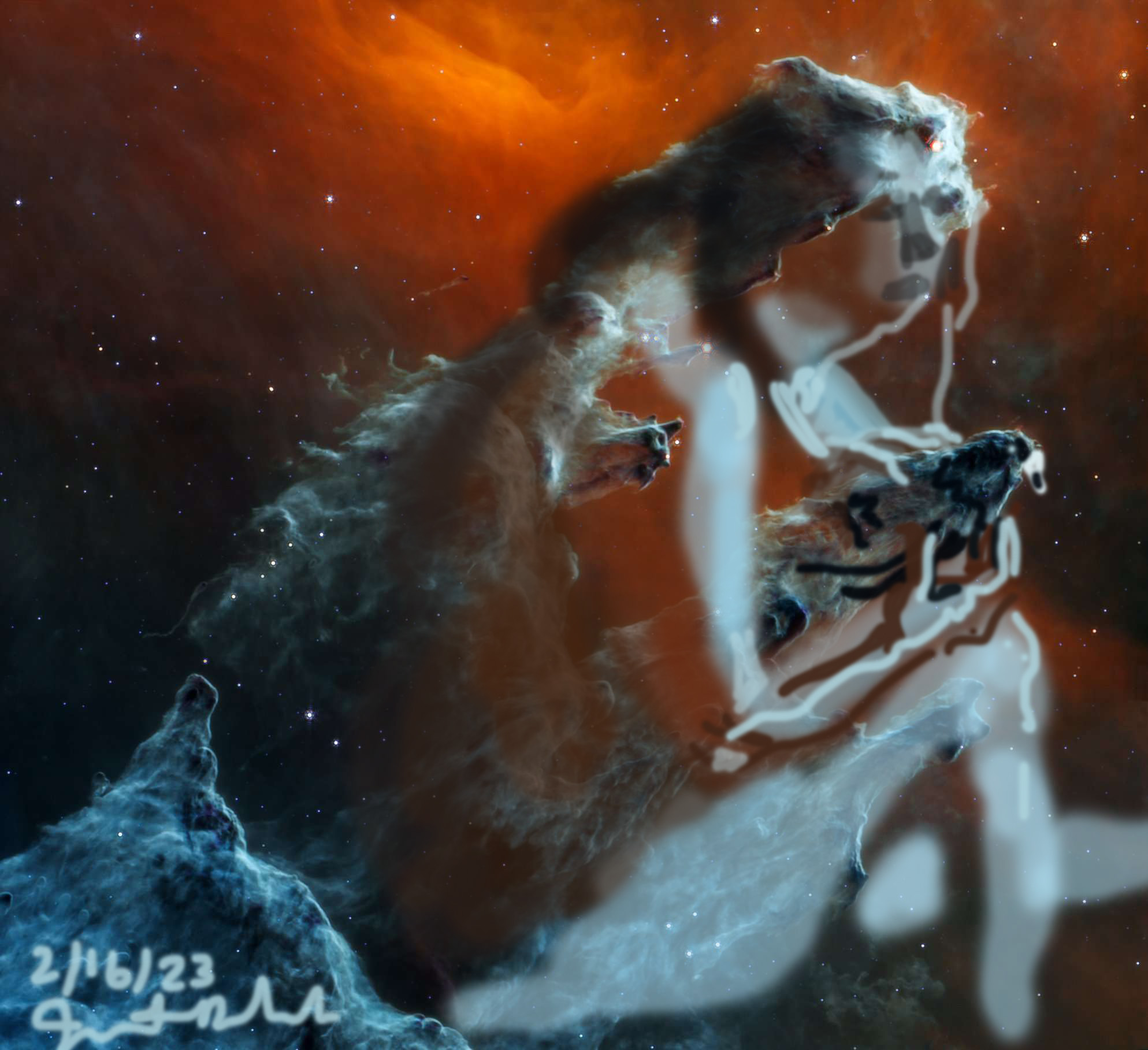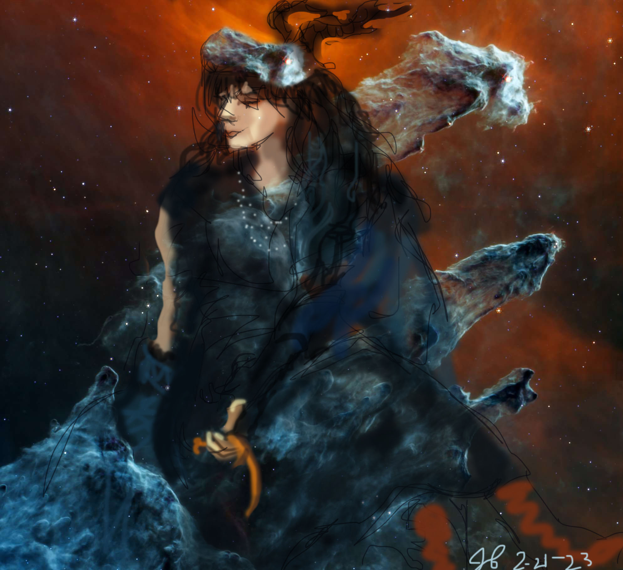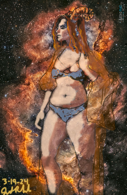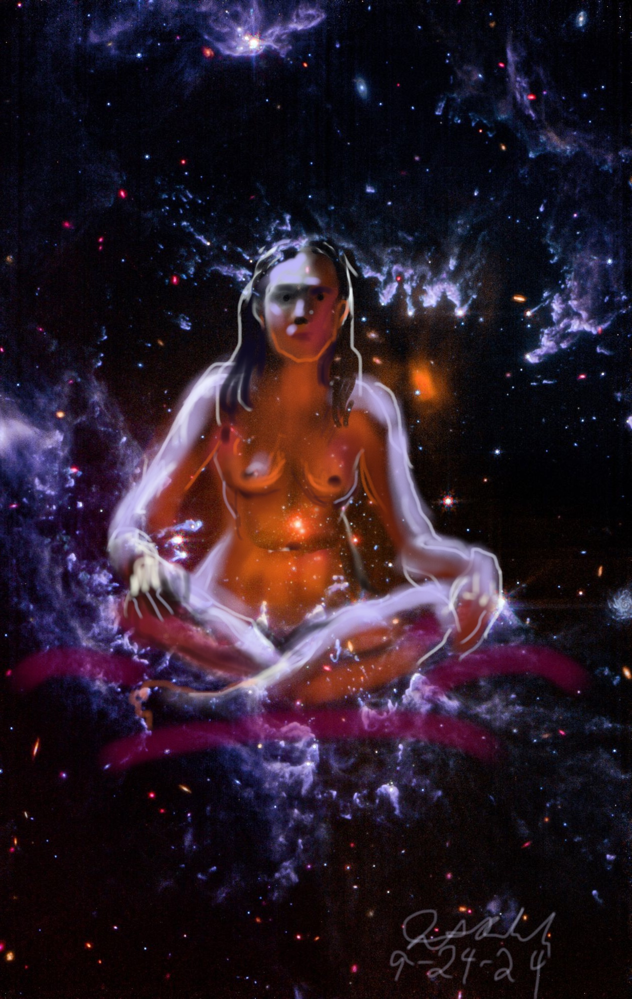Janet Bruesselbach has been making Astrae drawings since 2002. These are sketches all done with a laptop from live models in less than 40 minutes, using backgrounds from satellite space photography available online. All colors are sampled from the background (or allowed to show through from it). She uses only the generic image editing program brushes with the paint, eraser, and smudge tools. Every pose is from a live model, for as long as the model is posing, no longer. Many, especially earlier, sketches were done with her finger on a laptop touchpad, but she also uses a USB drawing tablet and pen. The method means embracing the idiosyncrasies of digital media more often valued for its invisibility. The Astrae reinvent the tactile intimacy of the traditional nude figure study, and imply human scale within naturally abstract technological wonders.